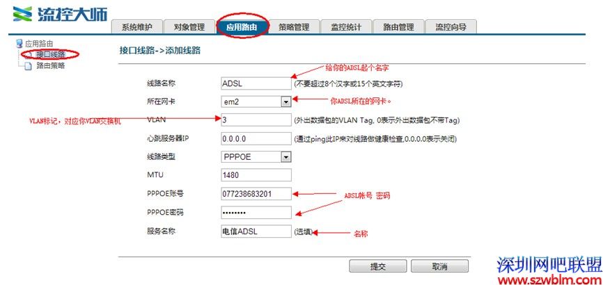 流控大师应用路由快速入门应用路由入门可以分为三步曲:1) 创建LAN口,2) 创建WAN线路,3) 添加路由策略